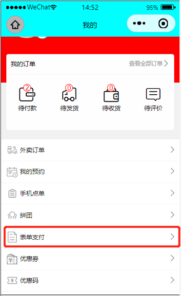 小程序端  建站前台:“设置” — “会员中心”— 勾选“表单支付”后,在会员中心显示“表单支付”即可查看支付的表单信息。